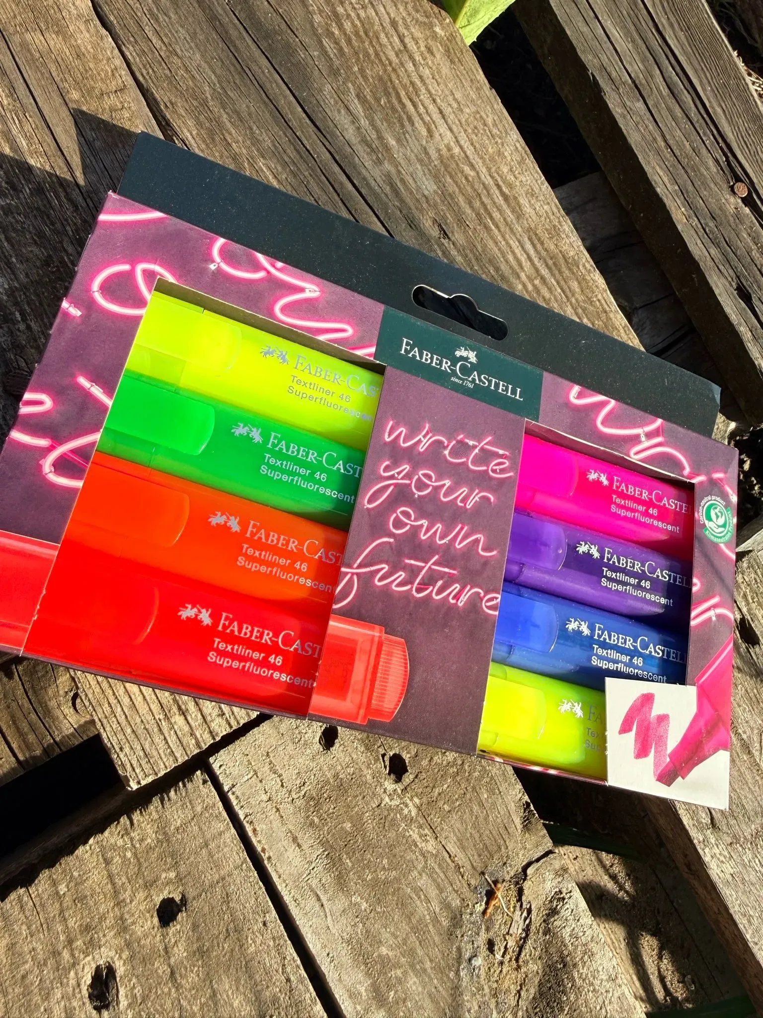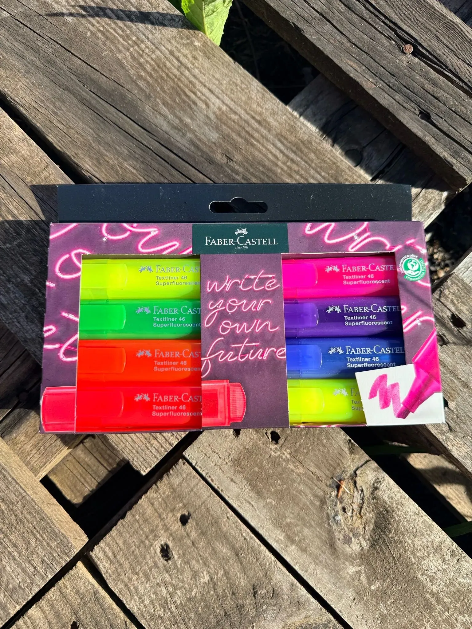 Integrado por 8 resaltadores en tonos neón🧡💛: 2 amarillos, 1 azul, 1 rojo, 1 rosado, 1 verde, 1 anaranjado y 1 violeta.